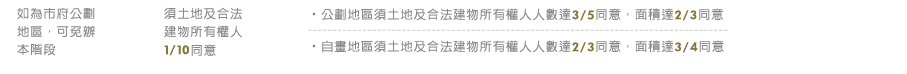 自劃地區須土地及合法建物所有權人人數達2/3同意,面積達3/4同意